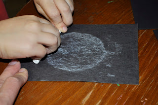 2) Tape the circle to the work surface. Cut a piece of black paper in four sections. Cover the circle with black paper.