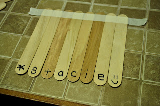 1. Tape down enough craft sticks for your child’s name. Write the name on the bottom.