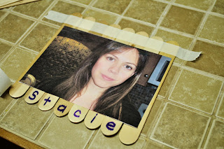 1. Print out a photo or find a picture. Tape down the craft sticks. Glue on the photo and allow to dry. Write each letter of your child’s name on a craft stick.