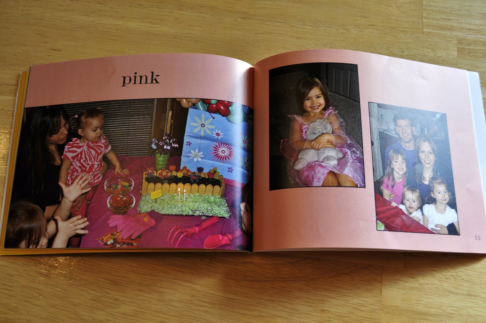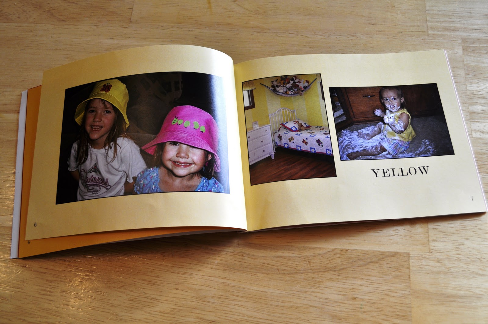To make this book, I selected photos from the past year with a dominant color in them and grouped them in the photo book. I added colored backgrounds, color names, and picked out a bright cover. Voila! A personalized color book!!
