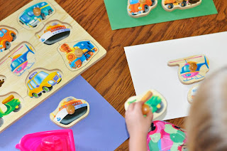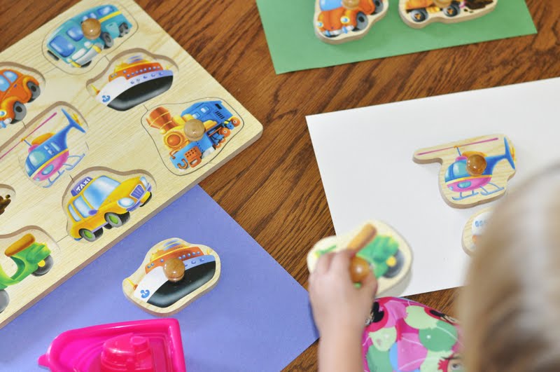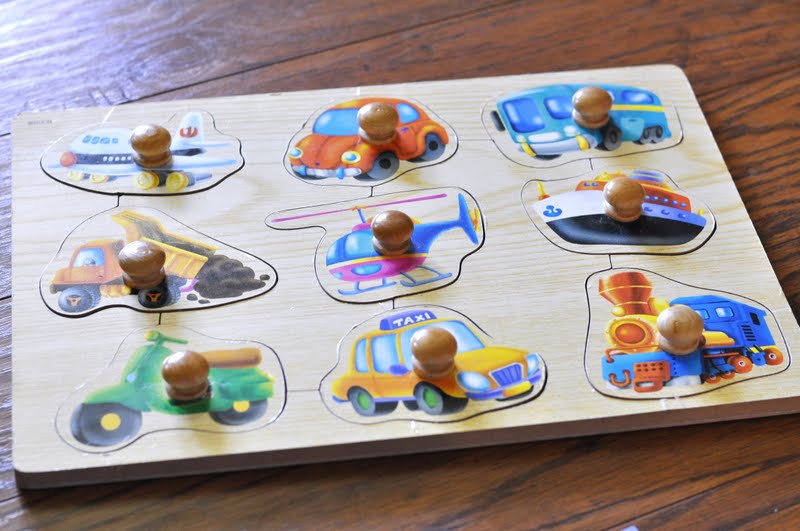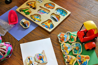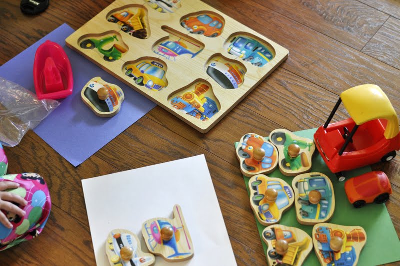 1) Round up all your planes, trains, boats, cars, etc. Place them in a pile. (We used a puzzle, because we don’t have many of these toys.)