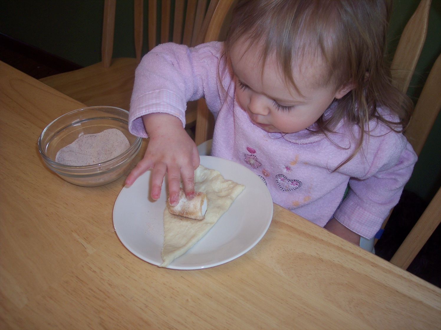 3. Roll up the marshmallow in the dough (Jesus’ body in the tomb). Make sure to pinch the sides and corners as well as you can (we had some leaky marshmallows!). Roll the outside of the dough in the cinnamon-sugar mixture. Each container should make eight rolls.