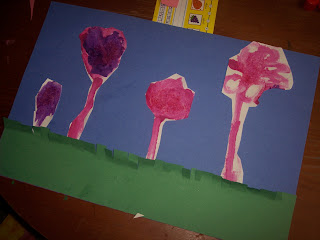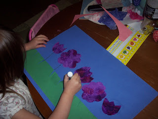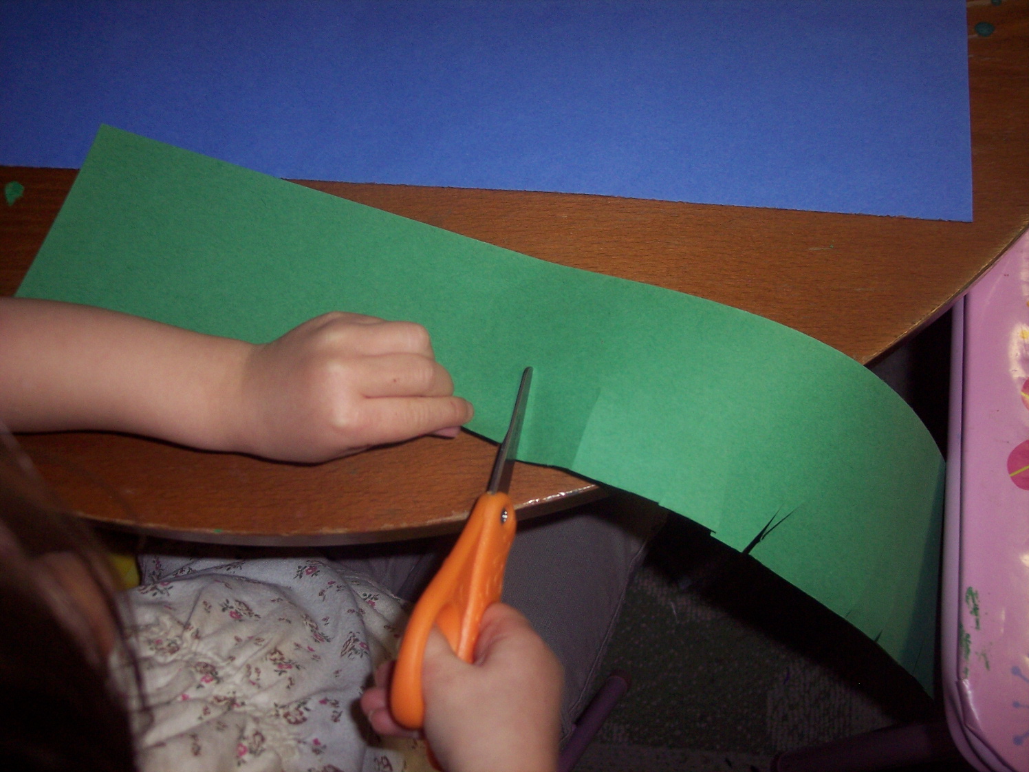 3) On a blue piece of construction paper, add a green rectangle for grass. If your child can use scissors, they could make small snips into it for grass. Cut out the flowers and glue them on!