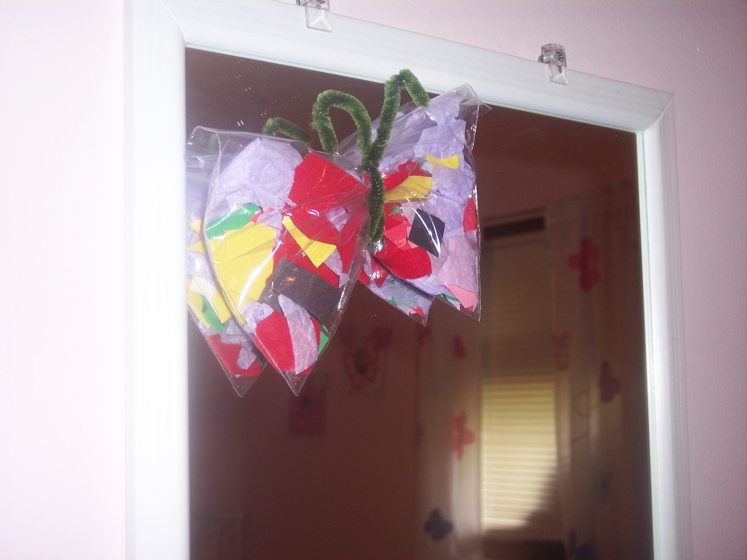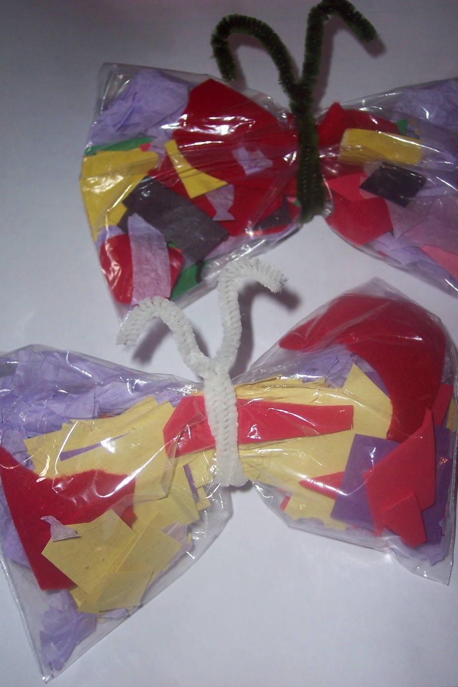 I have a box of scrap paper for the girls to use for art projects, and sometimes they like to use it for scissor practice. I can remember our oldest just sitting and cutting small pieces of paper for long periods of time. It drove me crazy because the scraps would be everywhere, but it kept her occupied and she learned to control her scissors! This project uses some of those paper scraps to make a butterfly!