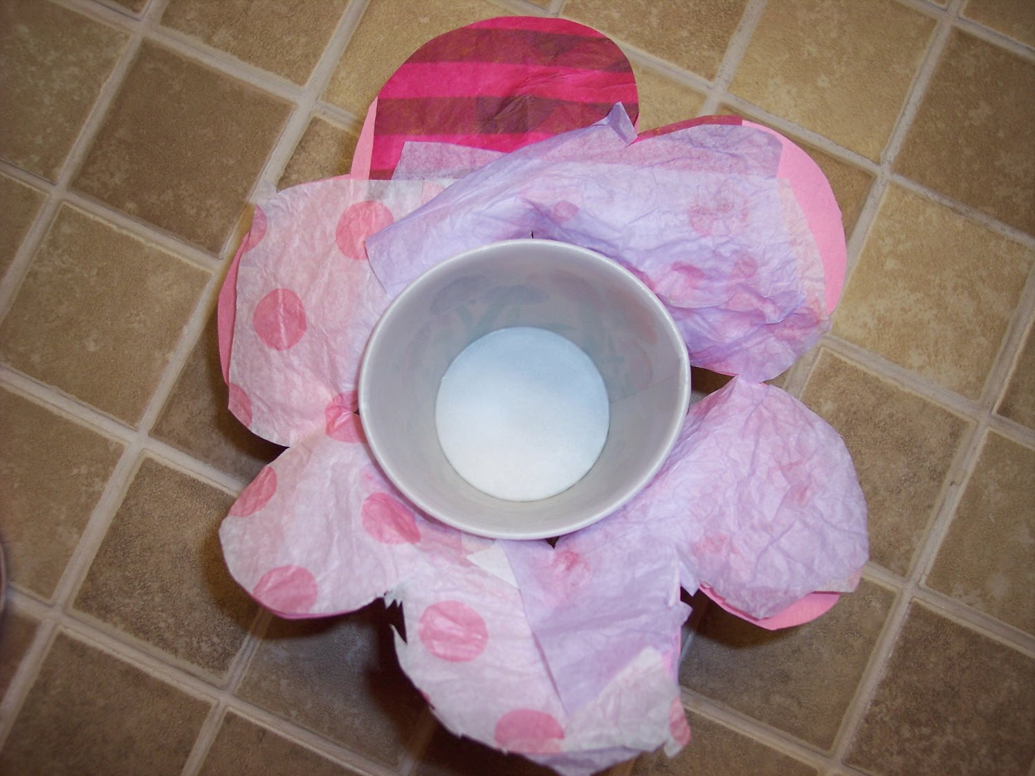 1) Cut out a flower shape from construction paper. We used paper from our scrap box (the tissue paper was already glued on it!). Then, bend in half and cut an X shape in the middle.