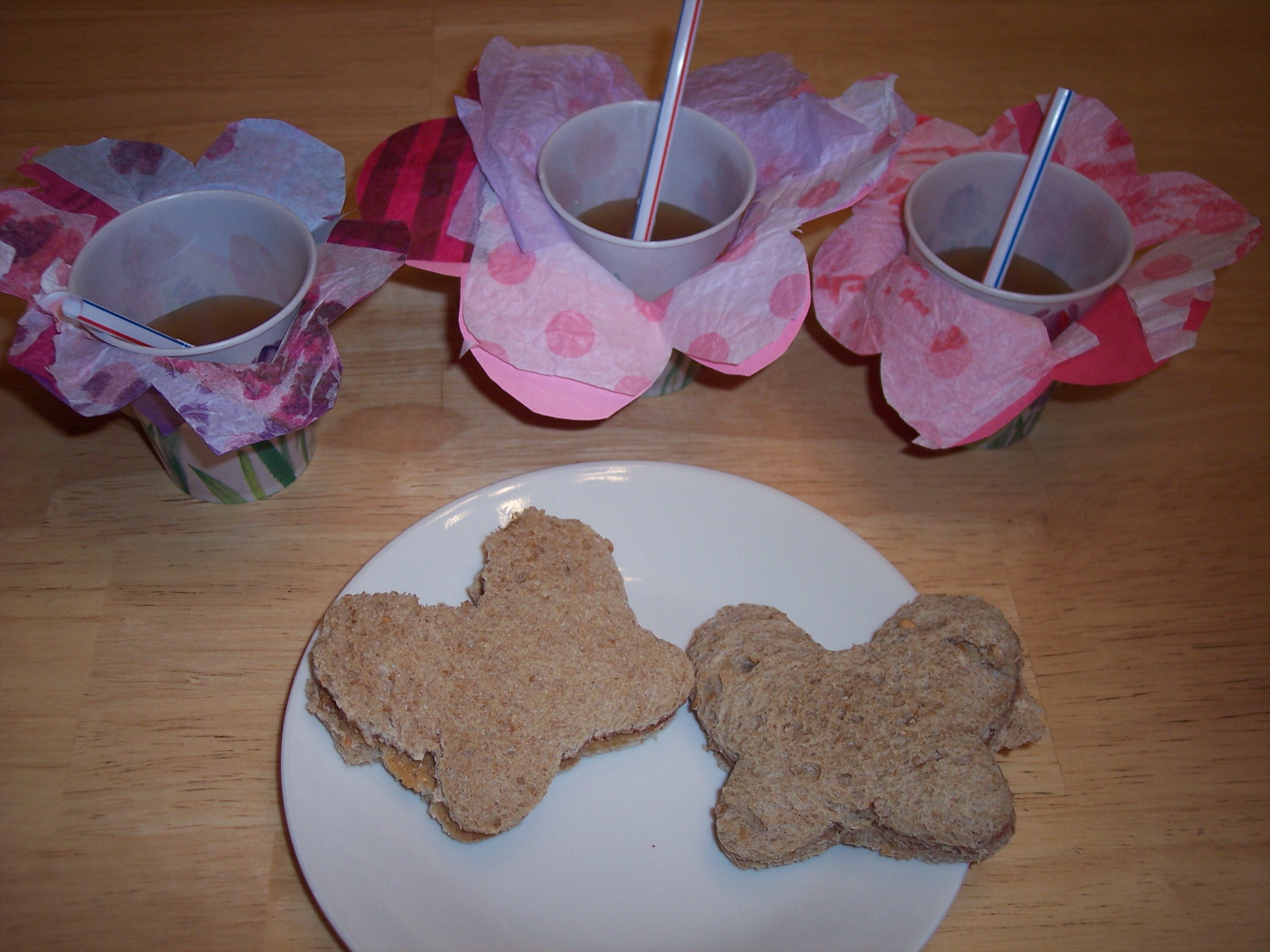 We had an impromptu Butterfly Lunch complete with nectar and cookie-cutter butterfly PB&J sandwiches (thanks to a suggestion from Little D — “Mommy, wouldn’t it be fun to make butterfly sandwiches?”).