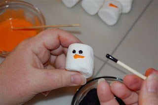 1) Mix 1 T. frosting with orange food coloring. Melt in the microwave. Repeat with the black coloring and frosting. (This will make enough for a bag of marshmallows.) Make an orange nose on the rounded sides of all the marshmallows with the pointed end of the skewer. After the noses are finished, add the eyes and mouth with black frosting (using the blunt end of the skewer).