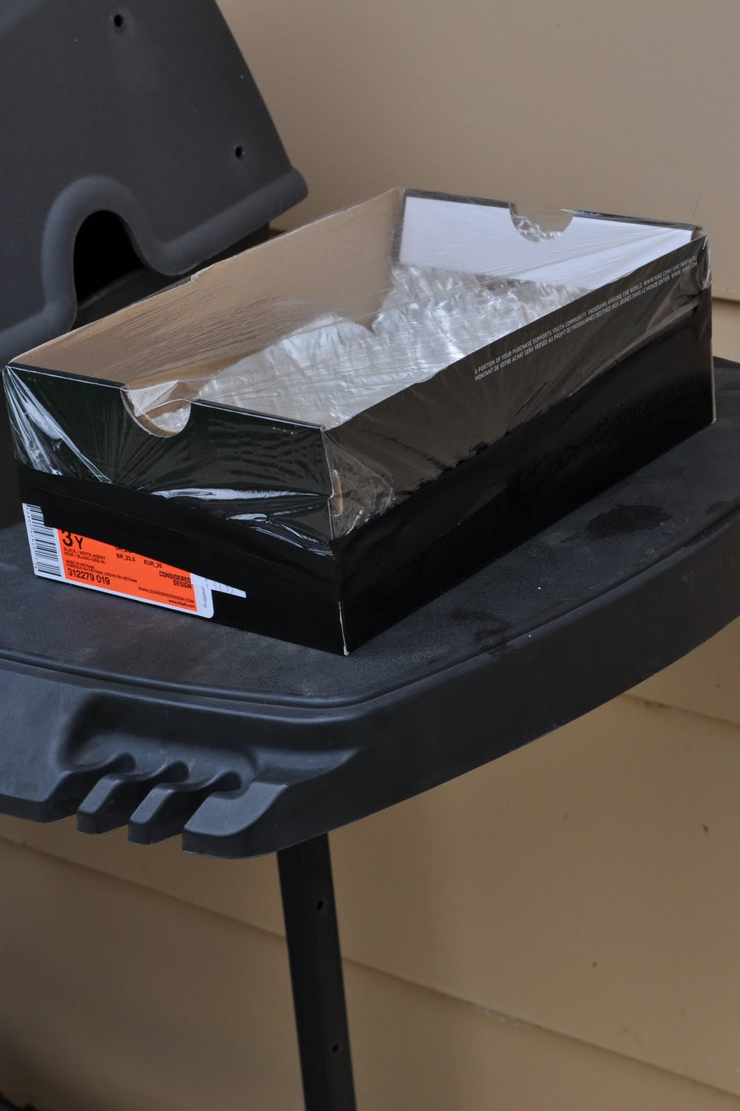 3) Place the box in the sunshine for one-half to two hours (depending on the temperature outside and how direct the sunlight). It was partly cloudy today, so it took longer for ours to work. I think it would work pretty quickly if there were no clouds in sight!