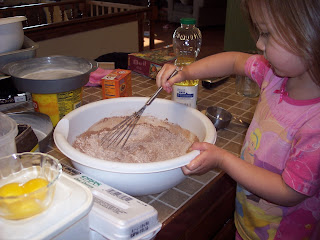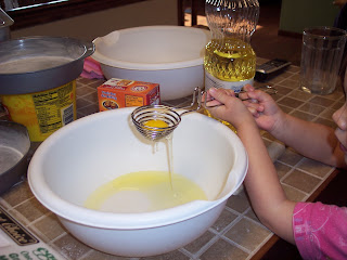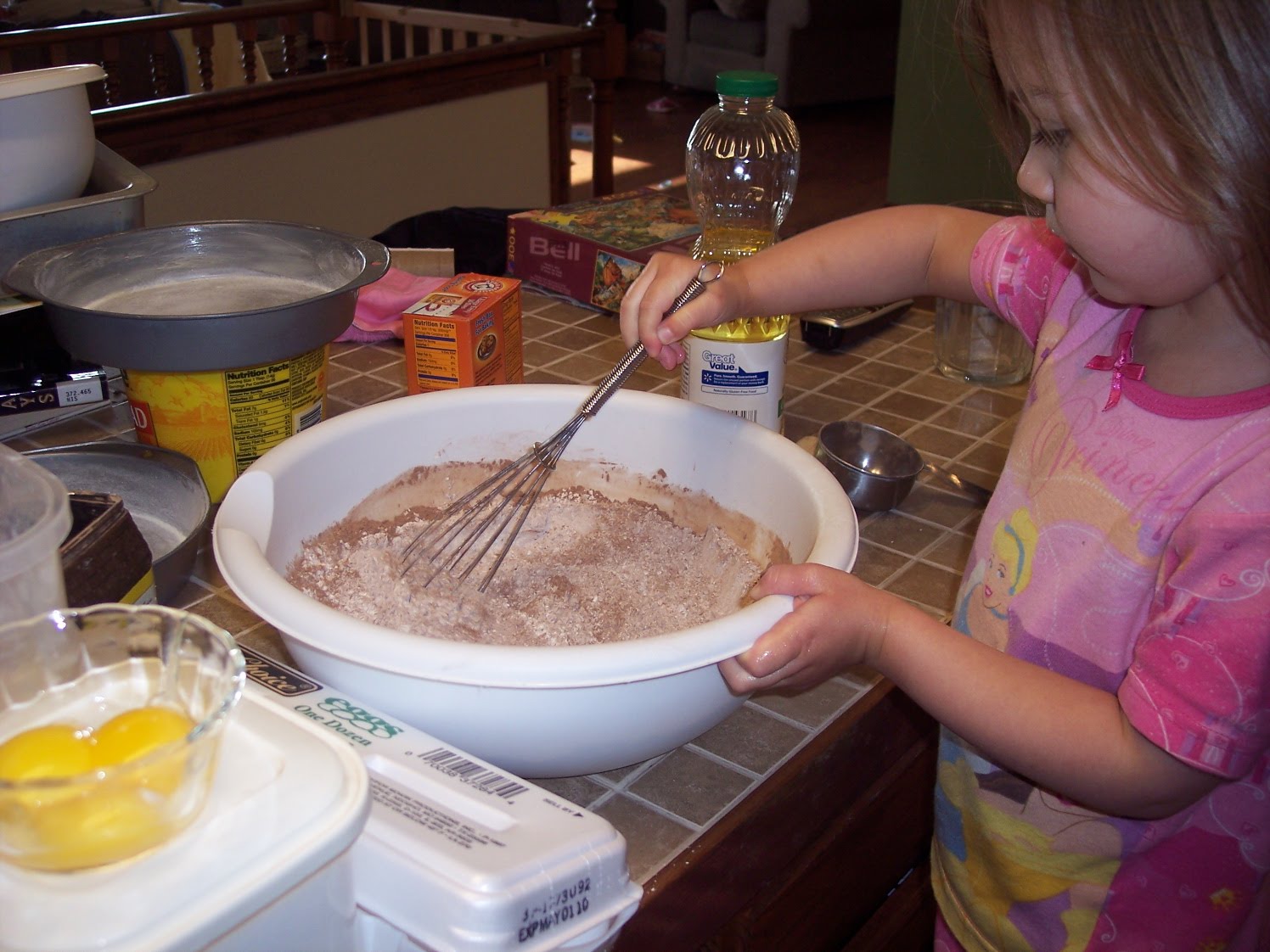 Combine the dry mixture with the wet mixture. Pour into prepared pans. Bake for 30-40 minutes. Don’t overbake! Our cake turned out a little dry, because I got distracted!!