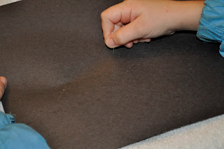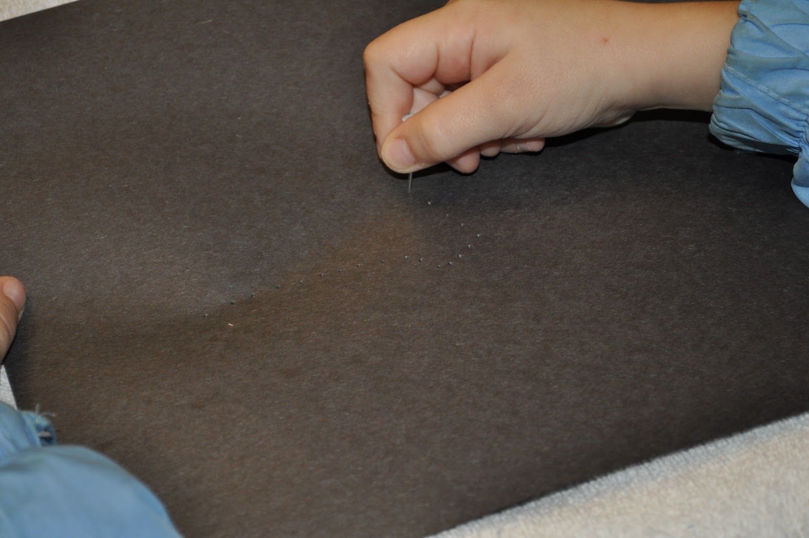 Another good option for this activity is to stick a piece of paper on a LiteBrite and poke through with the pieces. Then it lights up to show off the constellation as well as avoiding sharp items. Also, fun to see your result when you take it off afterward.