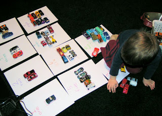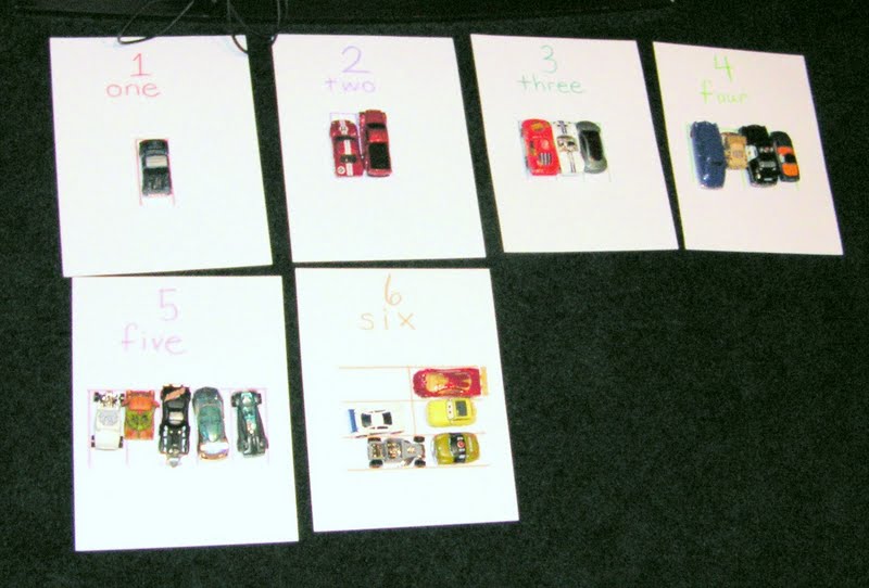 I knew Goober would be on board if I pulled out his cars, so I decided to create cards with the numeral, the number word, and the corresponding number of parking spaces. I used heavy white card stock and they have held up well.