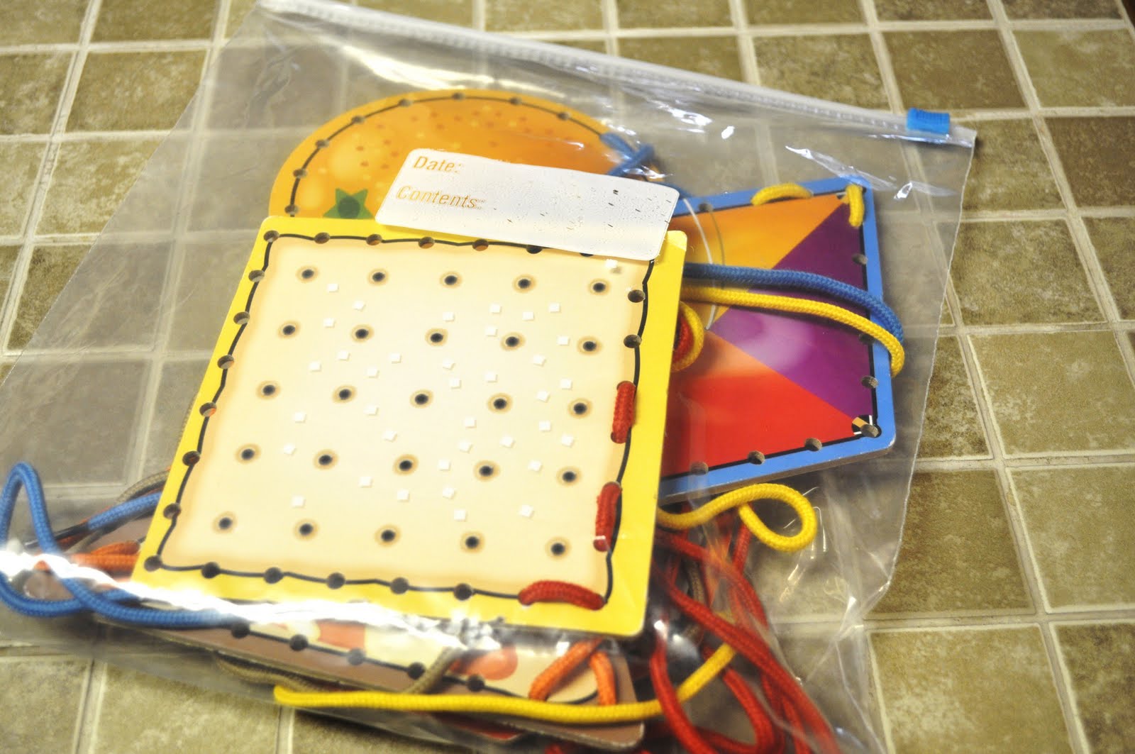 Spinning off the idea of learning bags, these travel activity bags are a great way to keep your child occupied on a long car ride. Here are five bags I’ve put together already!