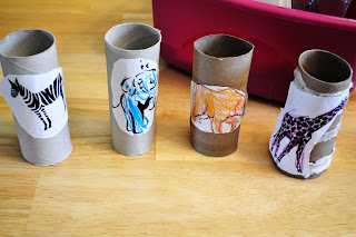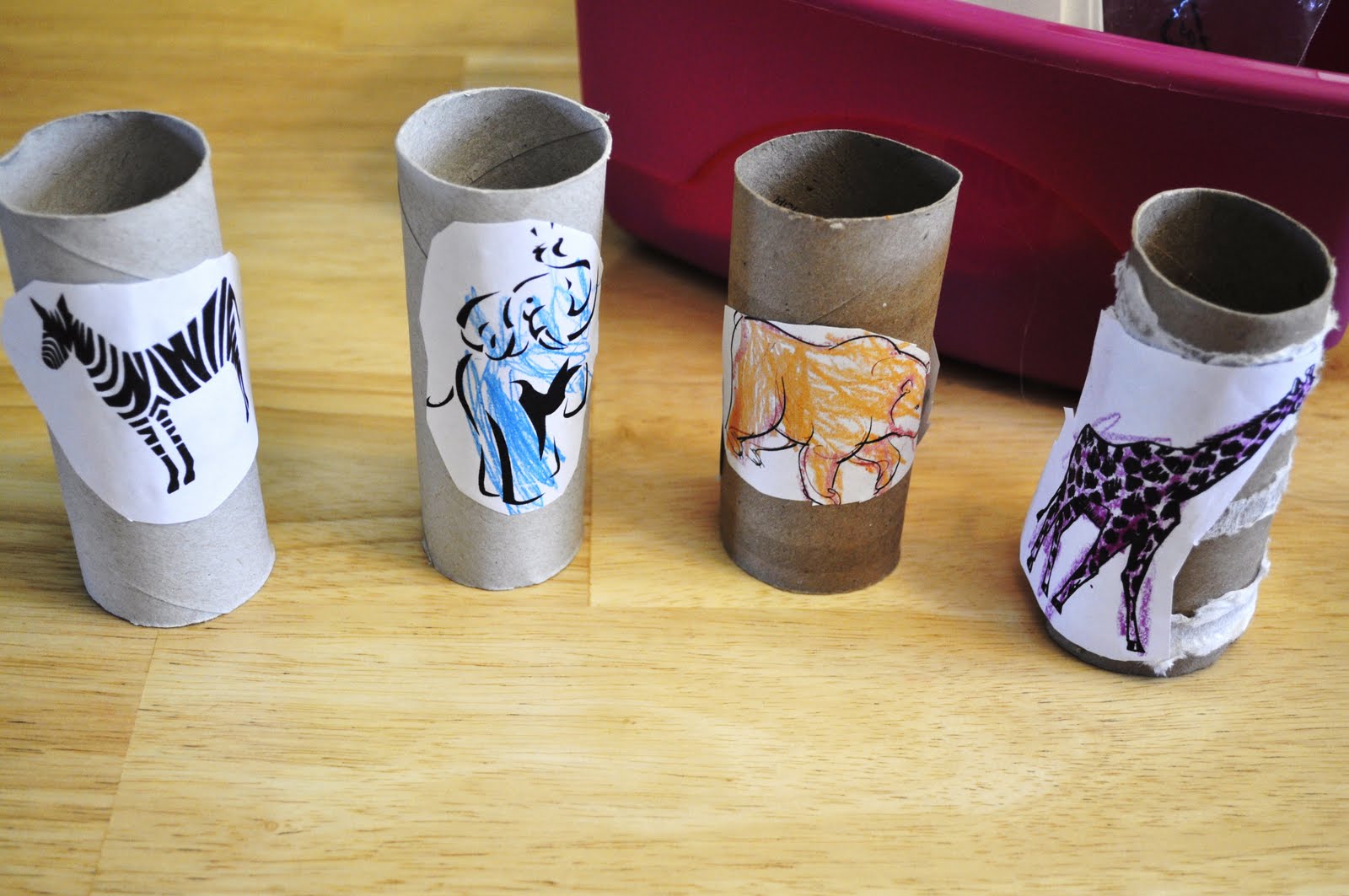 3) Glue the animals to the toilet paper tubes to make movable animal figures! If you use stickers, you can just stick them to the tubes!
